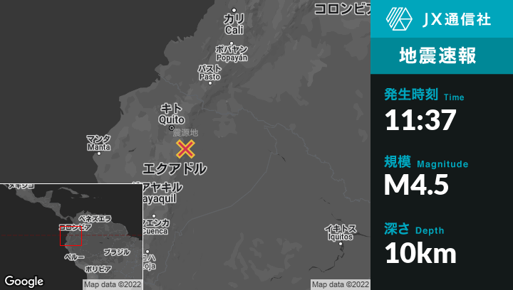 6月12日 11:37頃、エクアドルのArchidonaから北西34kmの地点でM4.5の地震がありました。