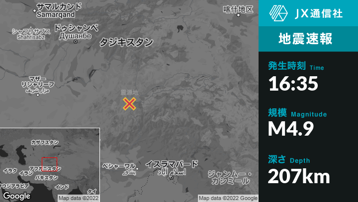 6月14日 16:35頃、アフガニスタンのAshkāshamから南西39kmの地点でM4.9の地震がありました。