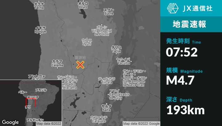 | 震源地 | チリのSan Pedro de Atacamaから北東125kmの地点 |