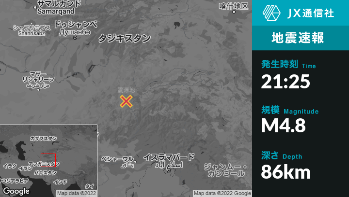 6月17日 21:25頃、アフガニスタンのAshkāshamから南西51kmの地点でM4.8の地震がありました。