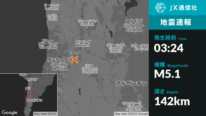 | 震源地 | アルゼンチンのMendozaから南西96kmの地点 |