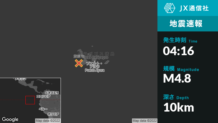 6月19日 04:16頃、エクアドルのPuerto Villamilから西北西60kmの地点でM4.8の地震がありました。
