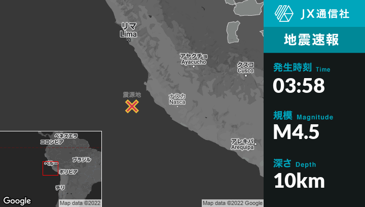6月20日 03:58頃、ペルーのParacasから南西114kmの地点でM4.5の地震がありました。