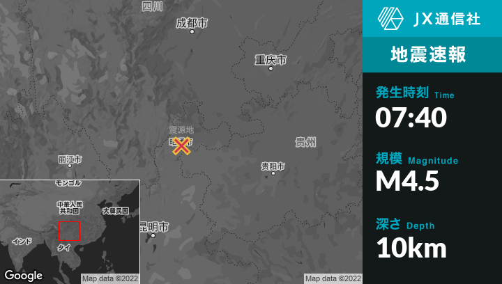 6月20日 07:40頃、中国のZhaotongから北22kmの地点でM4.5の地震がありました。