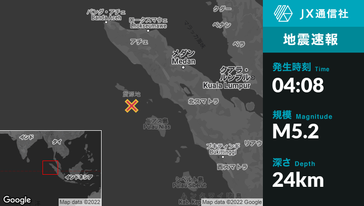 6月22日 04:08頃、インドネシアのSinabangから南49kmの地点でM5.2の地震がありました。