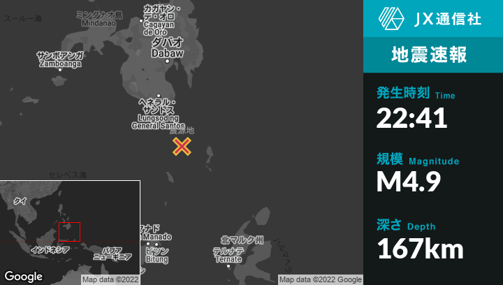 | 震源地 | フィリピンのSaranganiから南南東96kmの地点 |