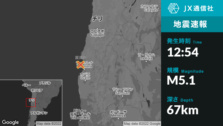 6月25日 12:54頃、チリのLa Serenaから北北西50kmの地点でM5.1の地震がありました。