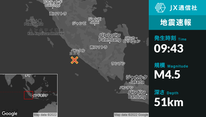 | 震源地 | インドネシアのBengkuluから南南西47kmの地点 |