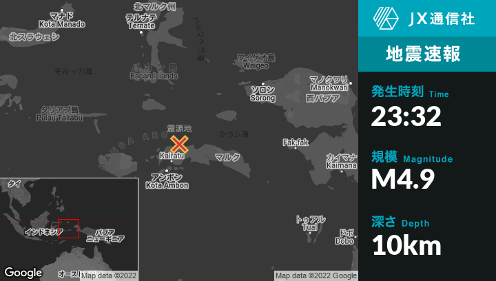 | 震源地 | インドネシアのAmahaiから北北西80kmの地点 |