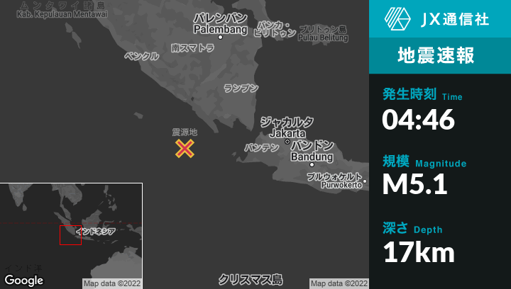 | 震源地 | インドネシアのBandar Lampungから西南西199kmの地点 |