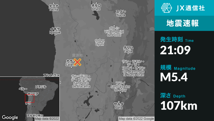 8月24日 21:09頃、チリのCalamaから北東68kmの地点でM5.4の地震がありました。