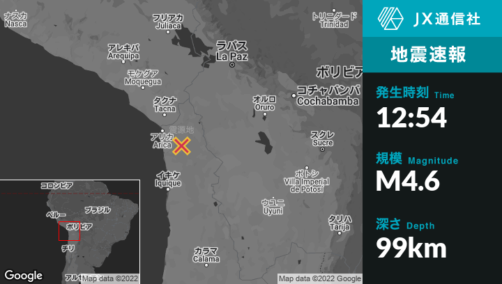 8月28日 12:54頃、チリのAricaから東南東70kmの地点でM4.6の地震がありました。