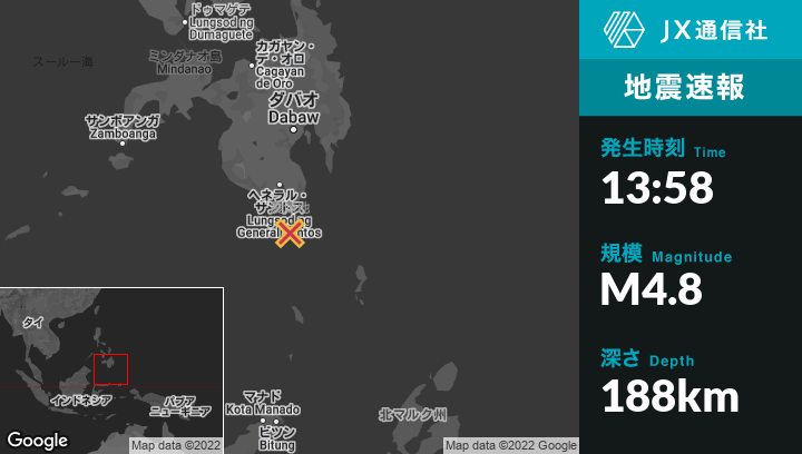 | 震源地 | フィリピンのSaranganiから南西15kmの地点 |