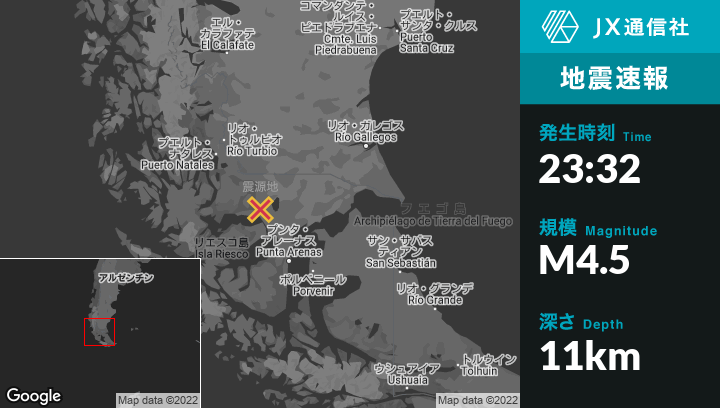 | 震源地 | チリのPunta Arenasから北北西94kmの地点 |