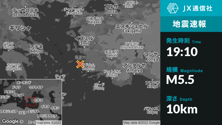 8月31日 19:10頃、ギリシャのMegálo Chorióから北西15kmの地点でM5.5の地震がありました。