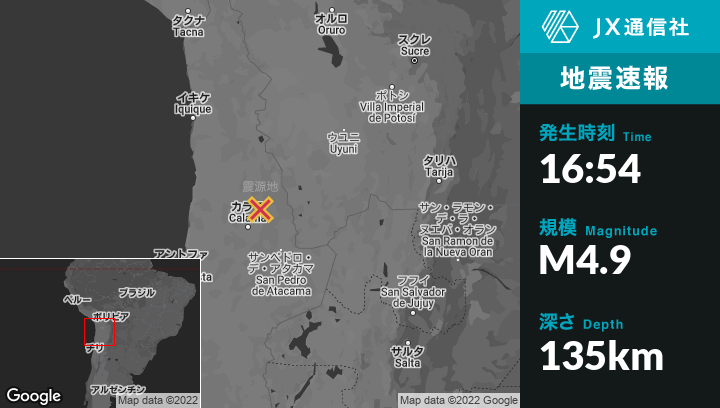 | 震源地 | チリのCalamaから北北東58kmの地点 |