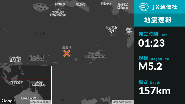 9月02日 01:23頃、東ティモールのLospalosから東北東255kmの地点でM5.2の地震がありました。