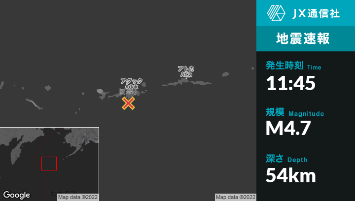 9月02日 11:45頃、アラスカのAdakから南南西31kmの地点でM4.7の地震がありました。