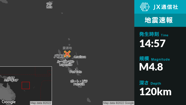 9月03日 14:57頃、バヌアツのPort-Olryから東北東29kmの地点でM4.8の地震がありました。