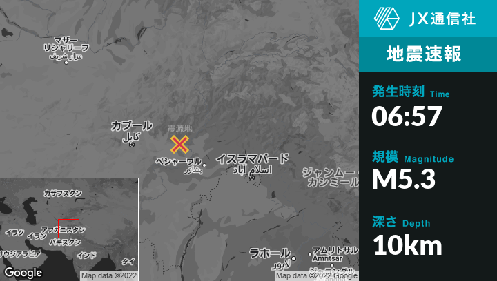 9月05日 06:57頃、アフガニスタンのJalālābādから北東38kmの地点でM5.3の地震がありました。