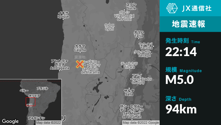 9月06日 22:14頃、チリのCalamaから南71kmの地点でM5.0の地震がありました。