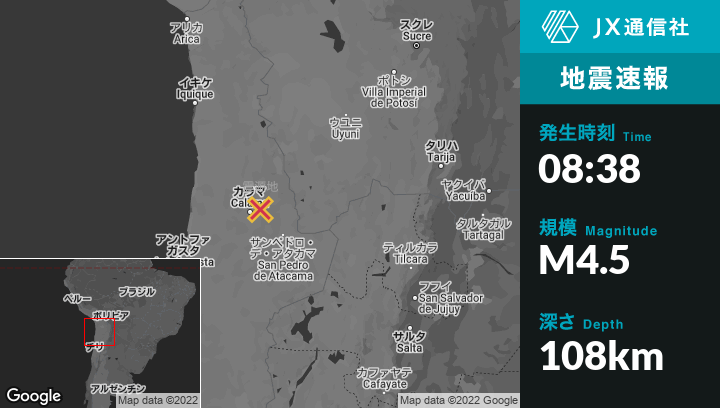 9月13日 08:38頃、チリのCalamaから北東29kmの地点でM4.5の地震がありました。