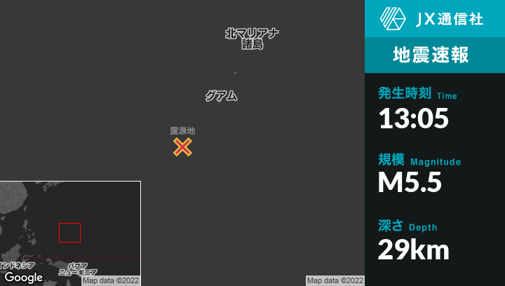 9月14日 13:05頃、グアムのMerizo Villageから南西184kmの地点でM5.5の地震がありました。