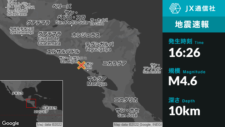 9月14日 16:26頃、ニカラグアのPuerto Morazánから西北西20kmの地点でM4.6の地震がありました。
