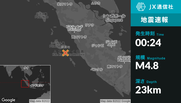 9月16日 00:24頃、インドネシアのPadangから南西142kmの地点でM4.8の地震がありました。