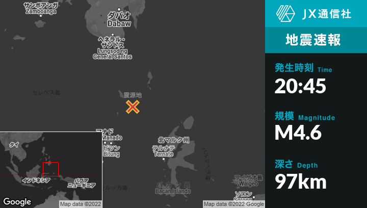 9月16日 20:45頃、ライキット II (ディメンベ)、インドネシアのLaikitから北北東218kmの地点でM4.6の地震がありました。