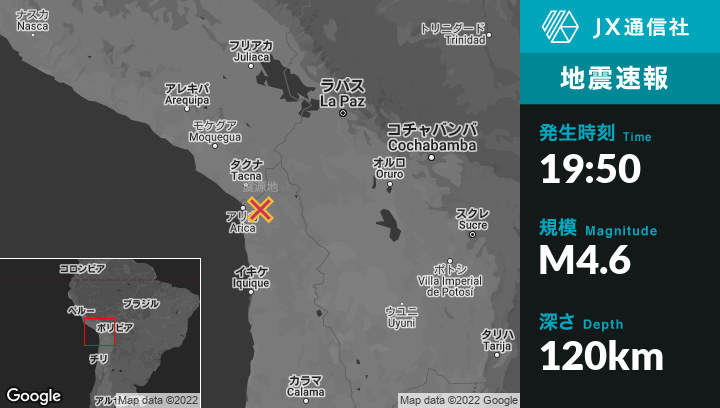9月17日 19:50頃、チリのAricaから東北東38kmの地点でM4.6の地震がありました。