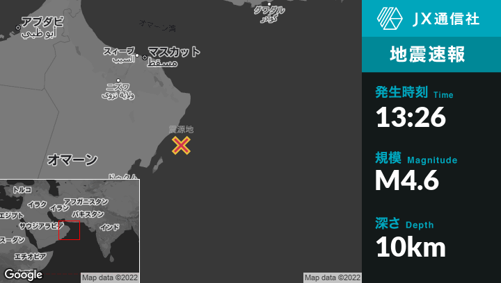 9月19日 13:26頃、オマーンのSurから南158kmの地点でM4.6の地震がありました。