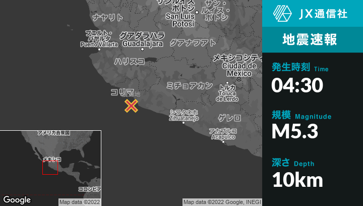 | 震源地 | メキシコのLa Placita de Morelosから西南西27kmの地点 |