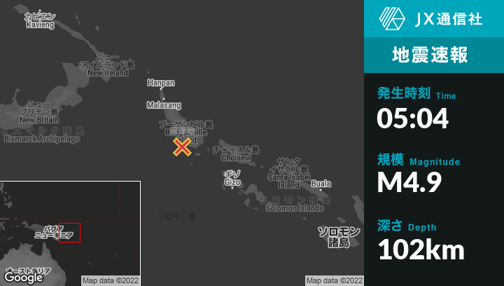 9月20日 05:04頃、パプアニューギニアのPangunaから南南西50kmの地点でM4.9の地震がありました。