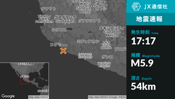 | 震源地 | メキシコのLa Placita de Morelosから南東9kmの地点 |