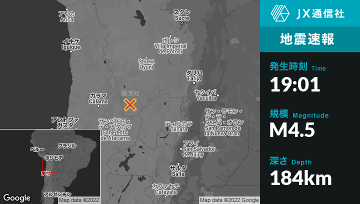| 震源地 | チリのSan Pedro de Atacamaから北東95kmの地点 |