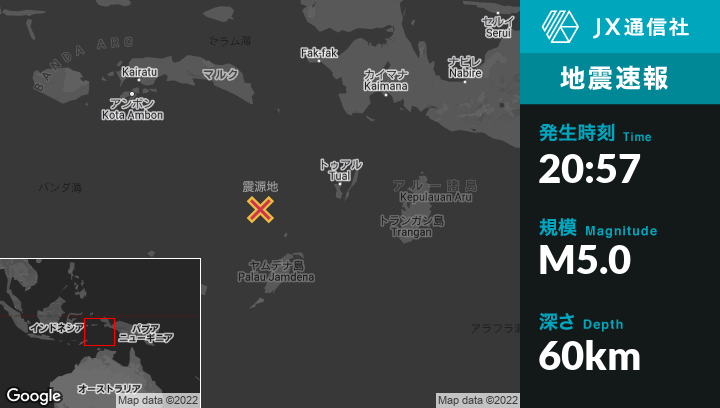 9月21日 20:57頃、インドネシアのTualから西南西198kmの地点でM5.0の地震がありました。