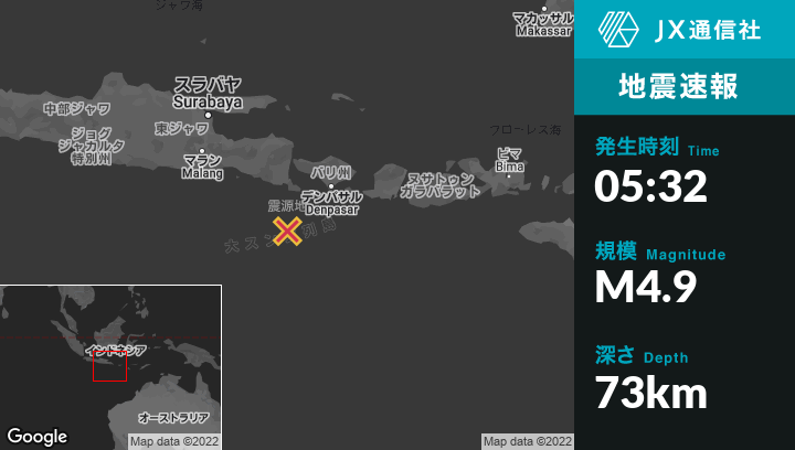 9月25日 05:32頃、インドネシアのMuncarから南111kmの地点でM4.9の地震がありました。
