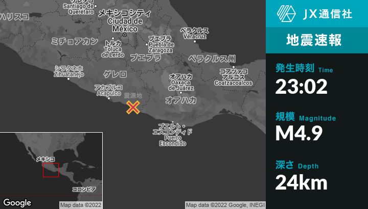 10月27日 23:02頃、メキシコのEl Polvorínから北北東1kmの地点でM4.9の地震がありました。