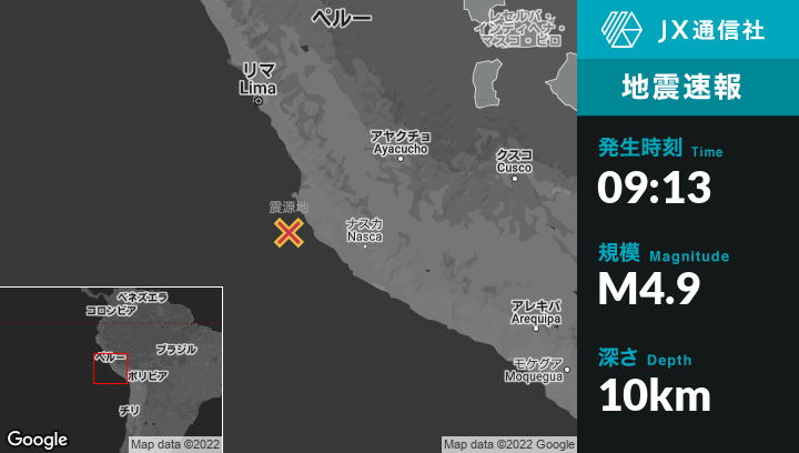 10月29日 09:13頃、ペルーのParacasから南南西67kmの地点でM4.9の地震がありました。