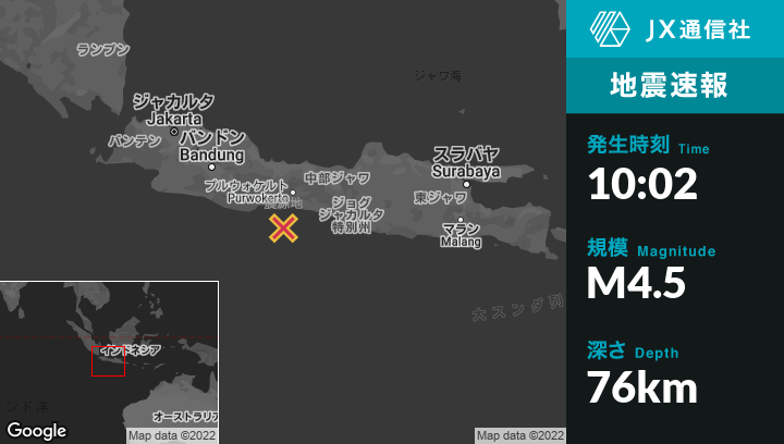 10月29日 10:02頃、インドネシアのKroyaから南南西47kmの地点でM4.5の地震がありました。