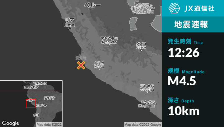 10月29日 12:26頃、ペルーのSantiagoから西南西63kmの地点でM4.5の地震がありました。