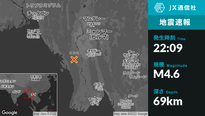 | 震源地 | ミャンマーのMinbuから南南西63kmの地点 |