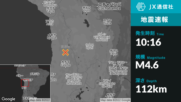 | 震源地 | チリのCalamaから北147kmの地点 |