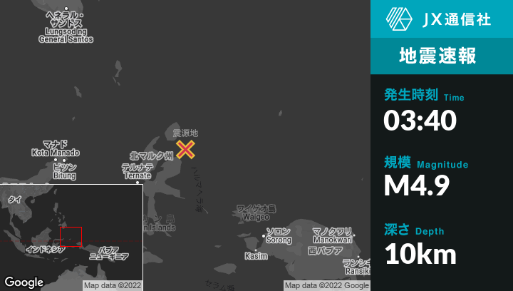 | 震源地 | インドネシアのTobeloから東北東95kmの地点 |