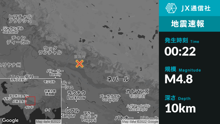 11月09日 00:22頃、ネパールのDipayalから東北東23kmの地点でM4.8の地震がありました。