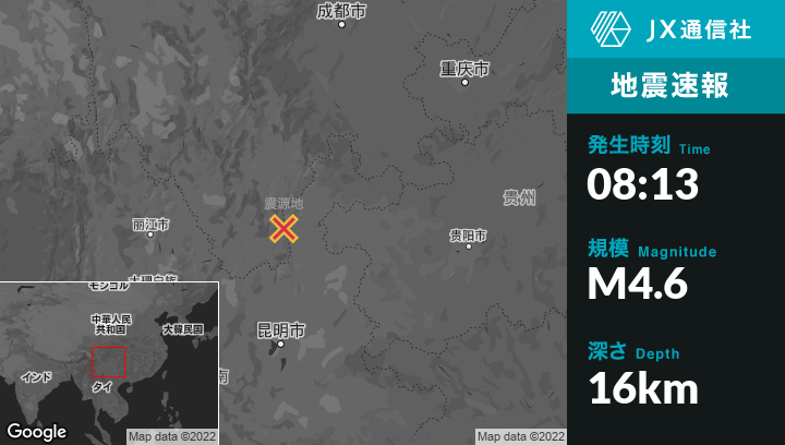 11月12日 08:13頃、中国のZhaotongから西南西86kmの地点でM4.6の地震がありました。