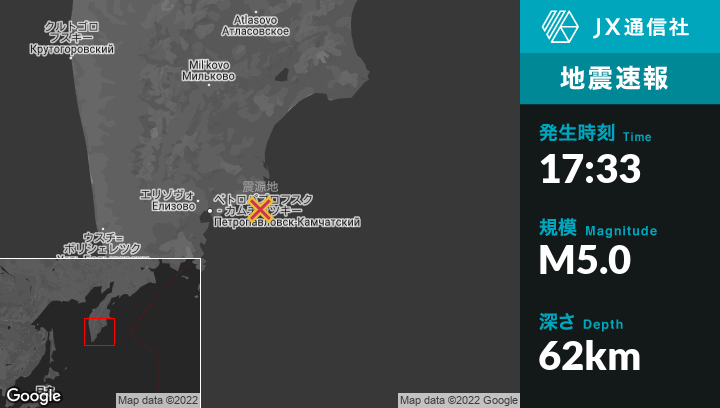 | 震源地 | ロシアのPetropavlovsk-Kamchatskyから東74kmの地点 |
