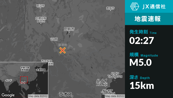 | 震源地 | 中国のGejiuから西93kmの地点 |