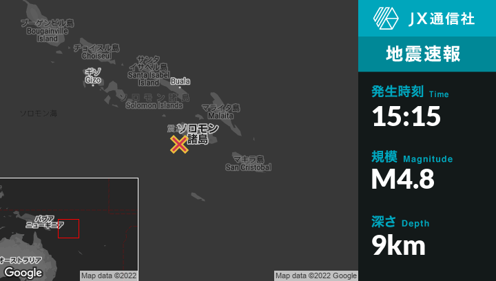 11月22日 15:15頃、ソロモン諸島のMalangoから南西21kmの地点でM4.8の地震がありました。